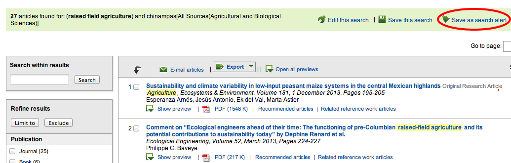 After you develop a good search strategy and get results, you can automate your research - the stored search will be run automatically and you will receive alerts that include direct links to new articles. In ScienceDirect, run your search and then click on "Save as Search Alert":