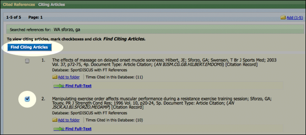 From here, you can choose an article of interest and click "Find Citing Articles" to see the papers that cite the one you have selected.