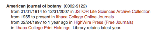 Now compare the date of your citation (in this case, 2004) to the date ranges for the different holdings. The library keeps only the most recent year of the print issues, so we don't have this article in print. But you have your choice of three kinds of online access. Clicking on the link for either JSTOR, Ithaca College Online Journals, or HighWire will take you to the appropriate journal. From there, you can navigate by date to the article you need.