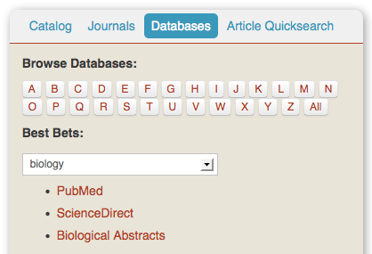 The key is finding the right database. If you already know the database that you need, you can go straight there through the A-Z database list on the front page (e.g., click "S" for ScienceDirect).