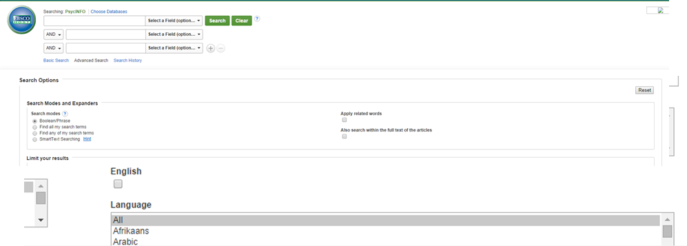 EBSCO databases have a lot of variety between each database. CINAHL (first) and PsychINFO (second) are somewhat different in terms of limiting to English only.