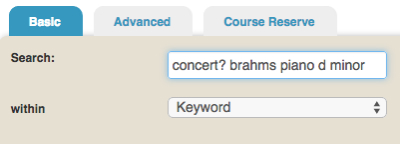 - Include known instruments, key, opus nos., and the composer's name (see example for finding a piano concerto -- note: search is not case sensitive)